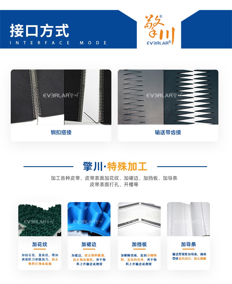 本樣品是易清潔輸送帶,用于食品機(jī)械中,用于輸送平時(shí)提升,加裙邊,可以大量的去輸送物品,輸送粉類、肉類等物品。我公司的加工的工業(yè)皮帶,長(zhǎng)度和寬度可根據(jù)客戶要求定制,也可以根據(jù)客戶需要都皮帶進(jìn)行特殊加工,可加導(dǎo)條,加擋板、擋塊或者加膠等。