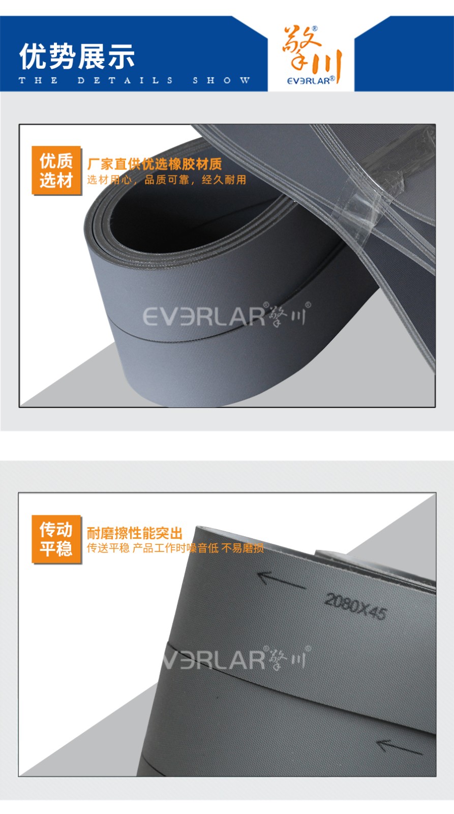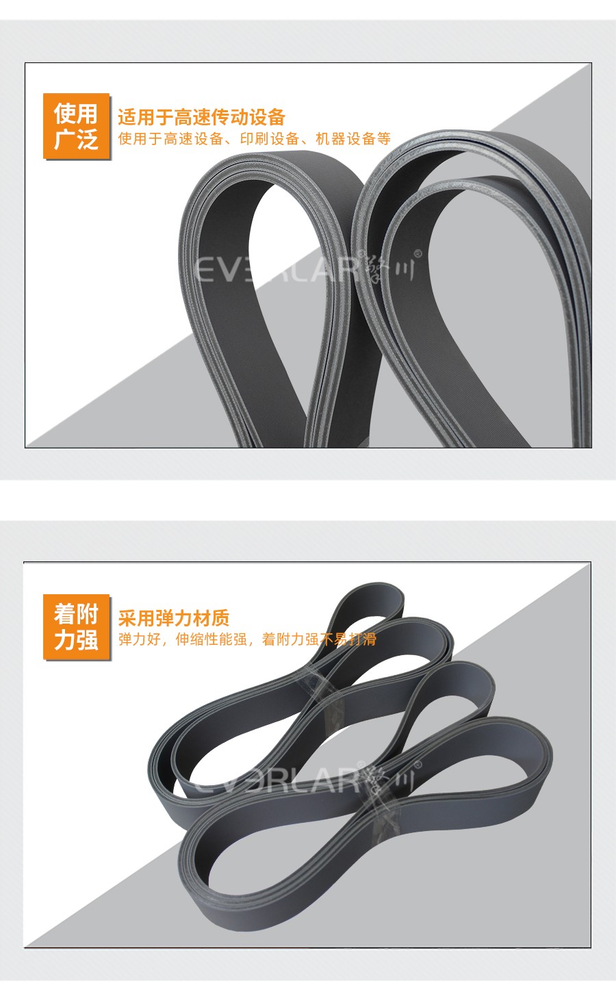 高速平皮帶(片基帶)是由高耐磨特種合成橡膠或皮革作為摩擦層,高強(qiáng)度尼龍片基作為骨架層,其合理的帶體結(jié)構(gòu),使該類產(chǎn)品具有優(yōu)異的綜合傳動(dòng)性能:使用壽命長(zhǎng),傳動(dòng)效率大于98%、傳遞速度大于60米/秒、曲撓性好。適用于傳動(dòng)機(jī)構(gòu)緊湊、線速高、速比大的場(chǎng)合。