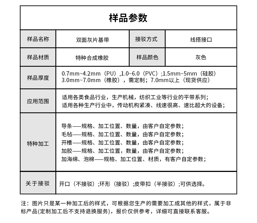備注:雙面灰色片基帶圖片只是某一種加工后的樣式,可根據(jù)您生產(chǎn)的需要加工成其他的樣式,屬于非標(biāo)產(chǎn)品(定制加工后不支持退換服務(wù)),報(bào)價(jià)僅供參考,詳細(xì)可直接聯(lián)系客服。