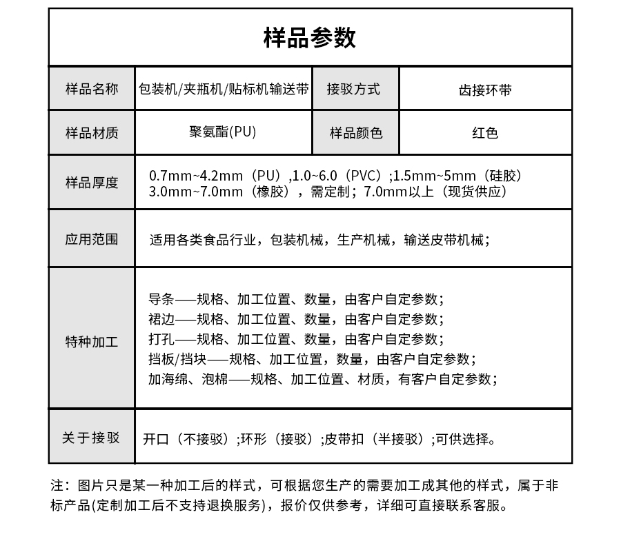 本樣品根據(jù)客戶行業(yè)需求加工定做,以PU輸送帶為底帶,加工紅色硅膠提高皮帶溫度耐受程度。底部?jī)蛇呍O(shè)計(jì)加工雙導(dǎo)條,加強(qiáng)穩(wěn)定,高度匹配客戶使用。