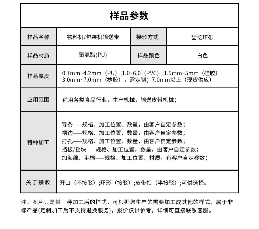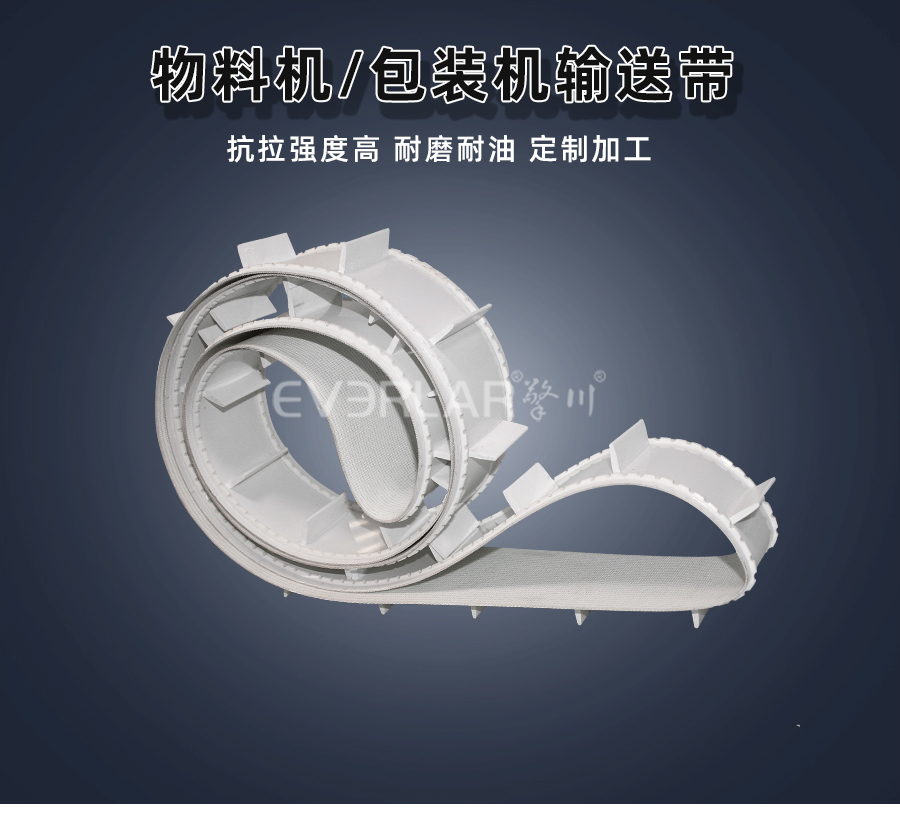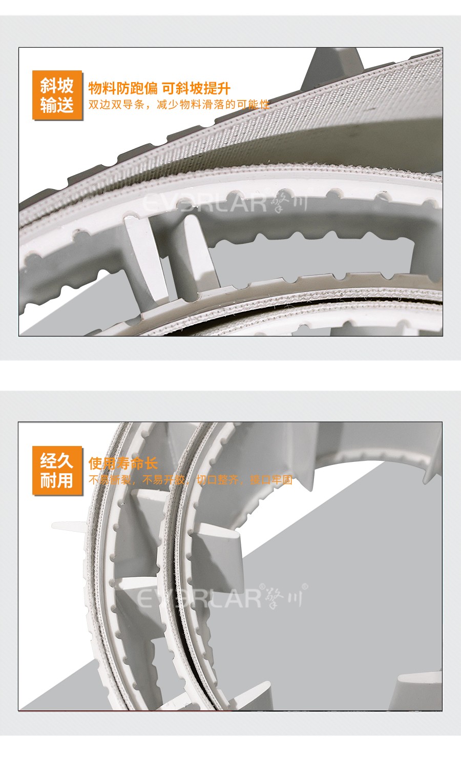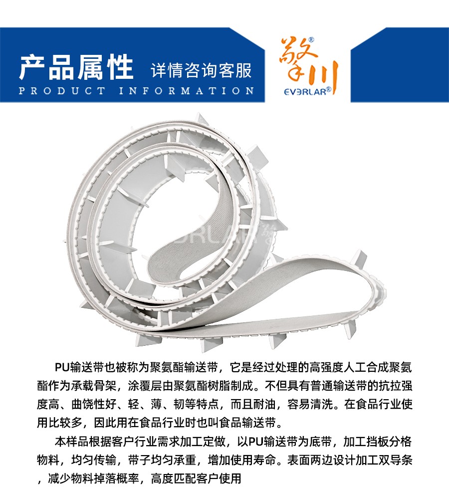 本樣品根據(jù)客戶行業(yè)需求加工定做,以PU輸送帶為底帶,加工擋板分格物料,均勻傳輸,帶子均勻承重,增加使用壽命。表面兩邊設(shè)計(jì)加工雙導(dǎo)條,減少物料掉落概率,高度匹配客戶使用。