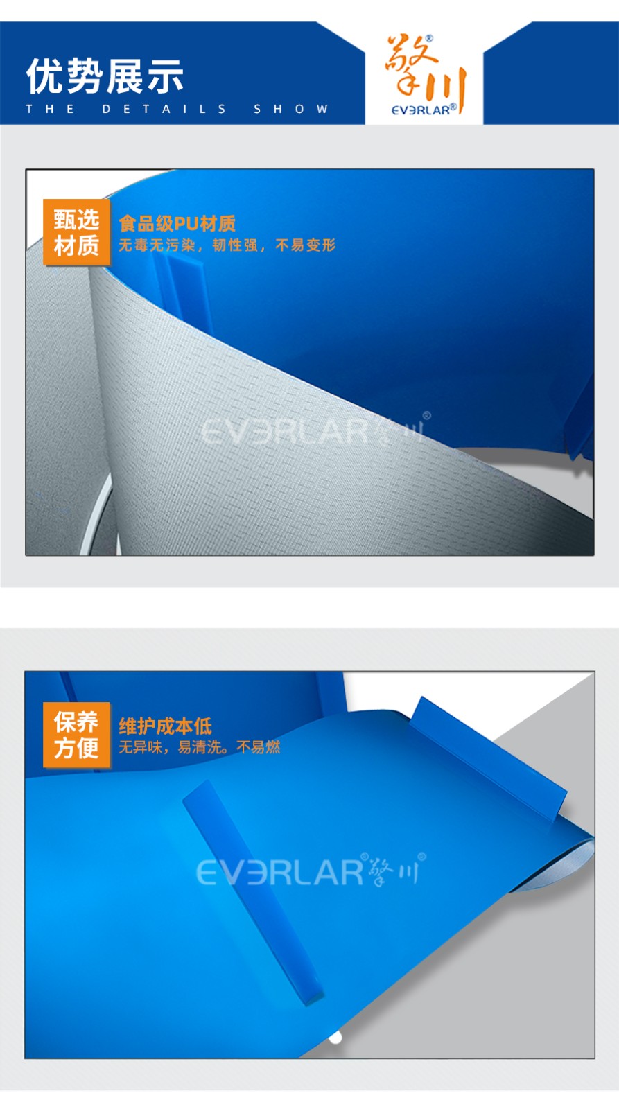 PU輸送帶也被稱為聚氨酯輸送帶,它是經(jīng)過處理的高強度人工合成聚氨酯作為承載骨架,涂覆層由聚氨酯樹脂制成。不但具有普通輸送帶的抗拉強度高、曲饒性好、輕、薄、韌等特點,而且耐油,容易清洗。在食品行業(yè)使用比較多,因此用在食品行業(yè)時也叫食品輸送帶。