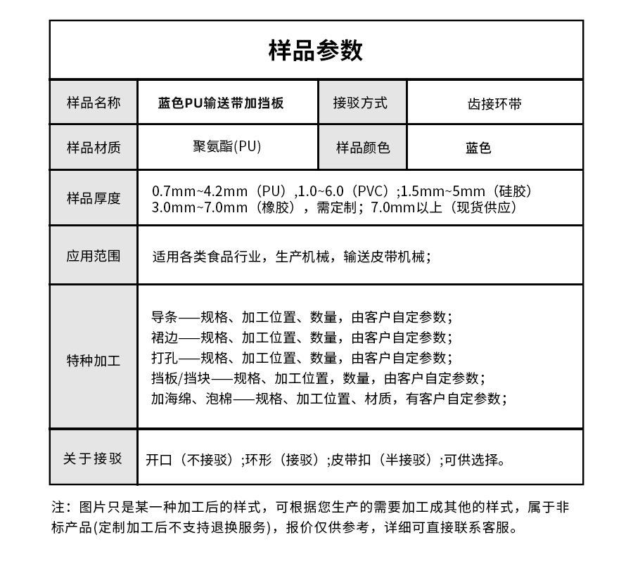 | 樣品名稱 | 藍色PU輸送帶加擋板 | 接駁方式 | 齒接環(huán)帶 |