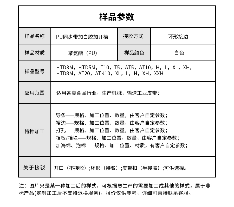 | 樣品名稱 | PU同步帶加白膠開槽 | 加工方式 | 加白膠、開槽 |