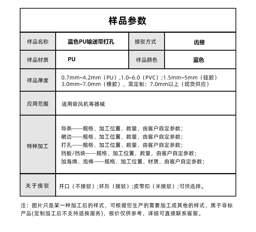 | 樣品名稱 | 藍(lán)色鉆紋PU輸送帶打孔 | 接駁方式 | 齒接 |