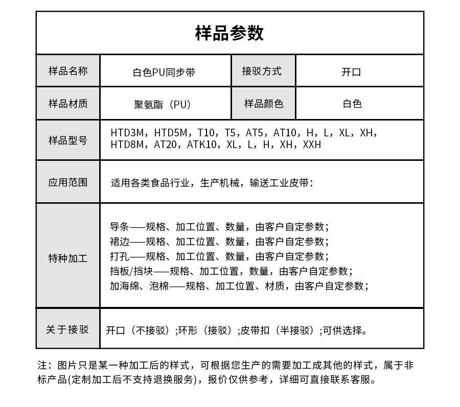 | 樣品名稱 | 白色PU同步帶 | 接駁方式 | 環(huán)形接邊 |