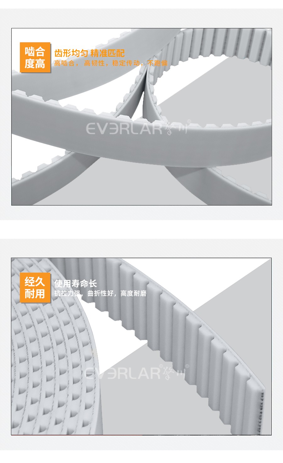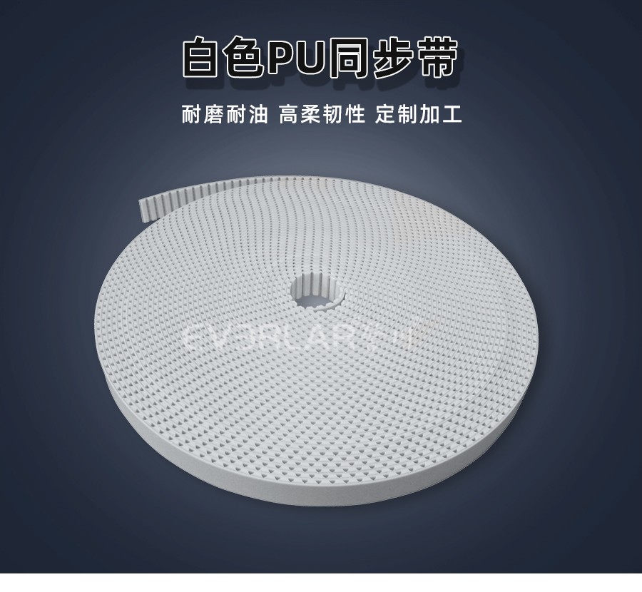 PU同步帶也被稱為聚氨酯同步帶,它是經(jīng)過處理的高強度人工合成聚氨酯作為承載骨架,涂覆層由聚氨酯樹脂制成。不但具有普通輸送帶的抗拉強度高、曲饒性好、輕、薄、韌等特點,而且耐油,耐磨。