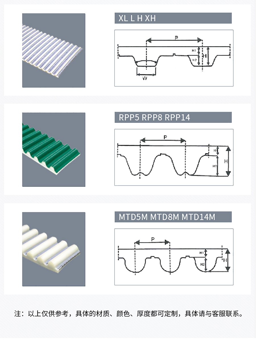 樣品型號 | HTD3M,HTD5M,T10,T5, AT5,AT10, H, L,XL, XH,HTD8M,AT20, ATK10, XL,L,H,XH,XXH | 應用范圍 | 適用各類生產(chǎn)機械 |