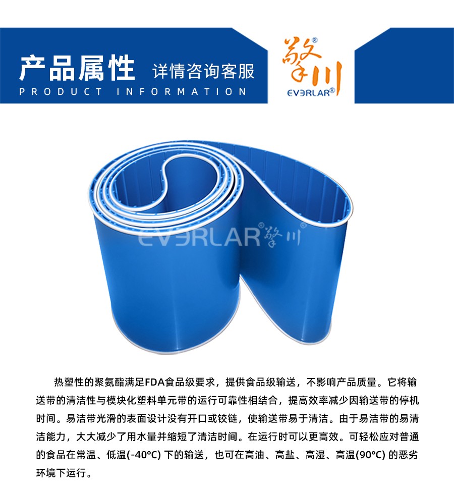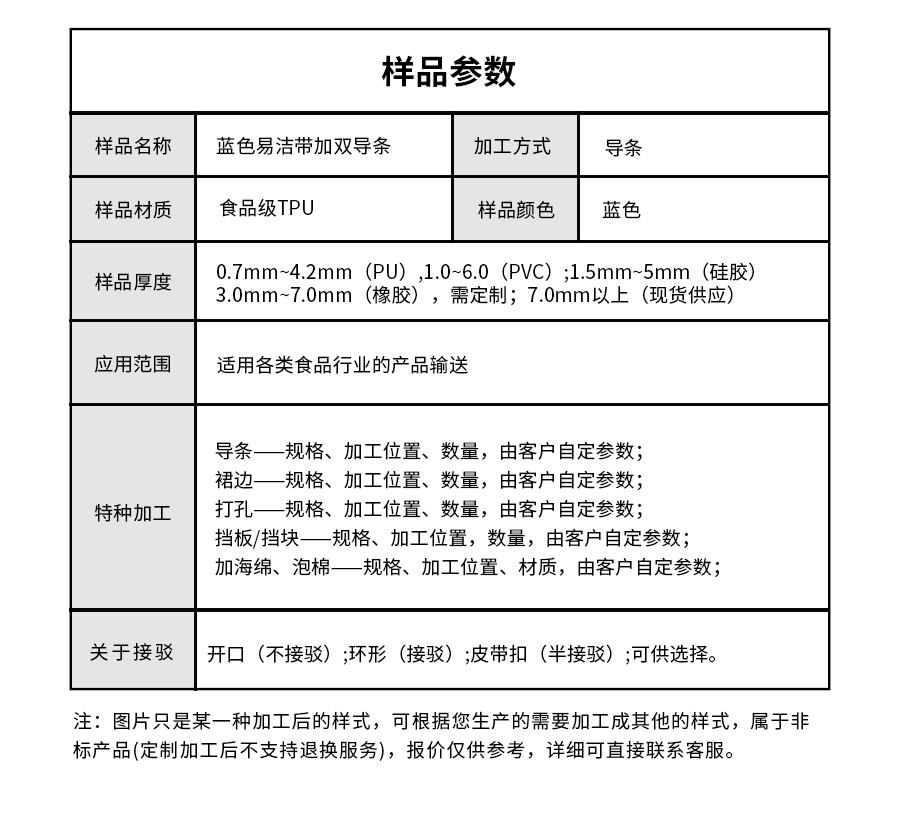 • 產(chǎn)品名稱:藍色易清潔帶加雙導條肉類機械設備皮帶