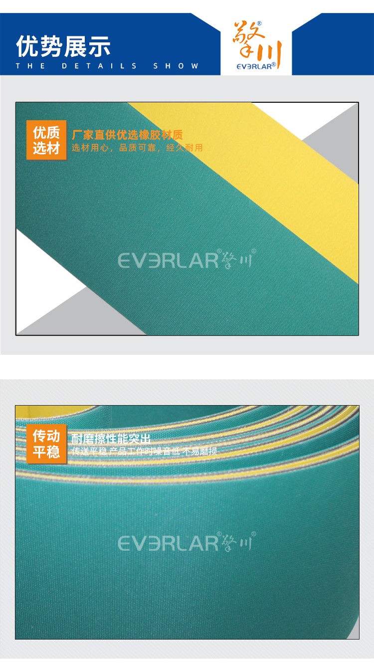 • 產(chǎn)品名稱:黃綠片基帶食品輸送帶定制擎川everlar工業(yè)皮帶
