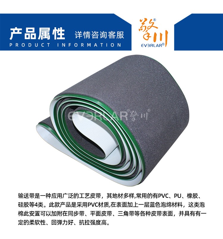 • 產(chǎn)品名稱:綠色PVC輸送帶加黑色泡棉耐磨耐腐蝕耐高溫工業(yè)皮帶定制