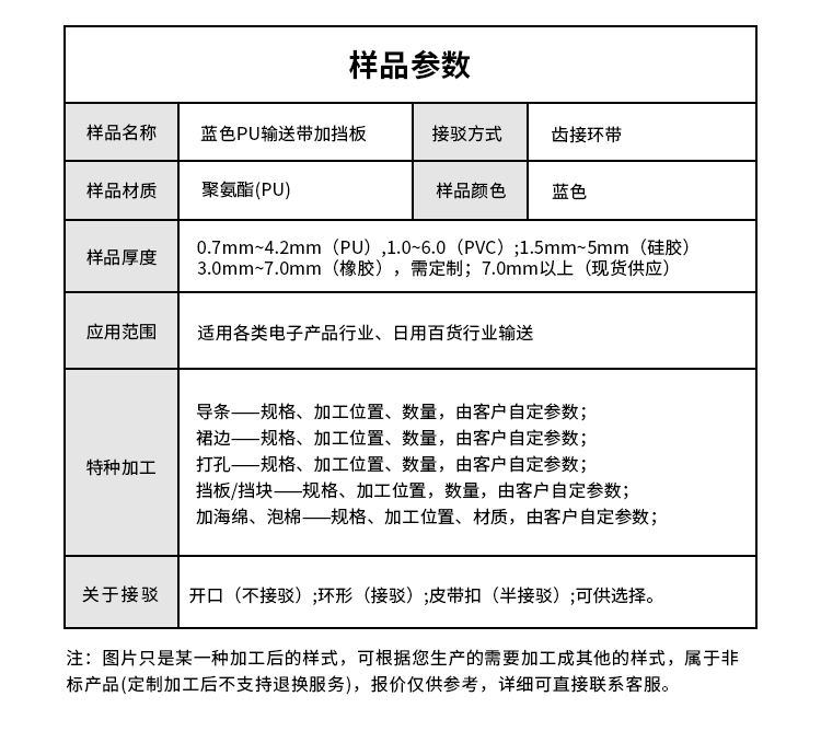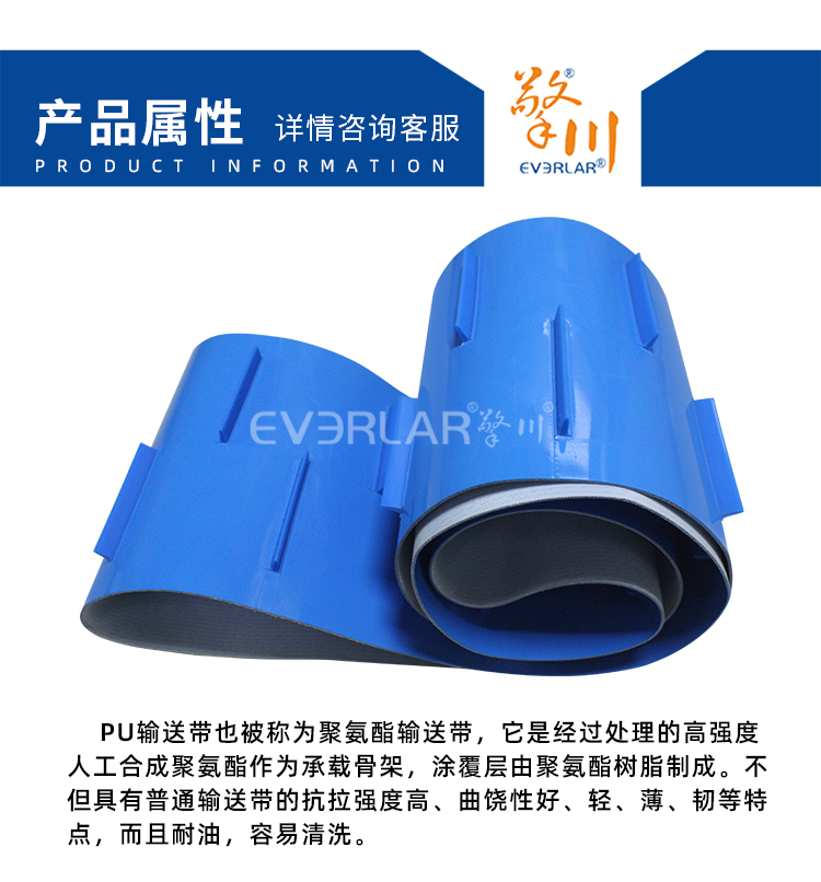 • 產(chǎn)品名稱:藍色PU輸送帶加擋板耐磨耐油耐腐蝕工業(yè)皮帶定制