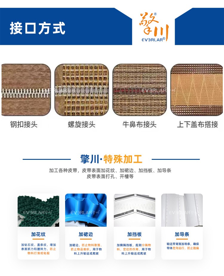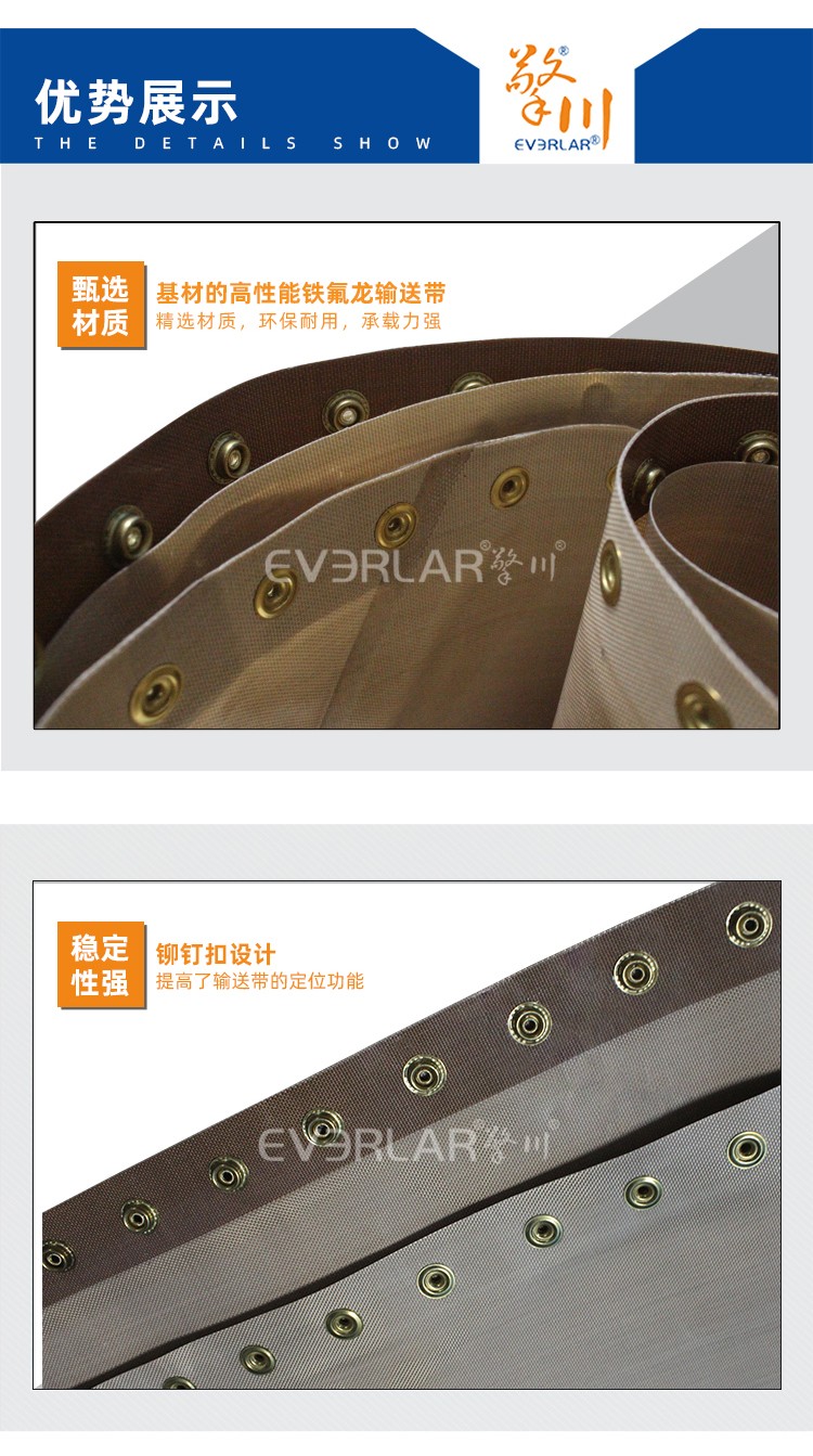 • 產(chǎn)品名稱:特氟龍輸送帶加鉚釘扣耐腐蝕耐高溫易清潔工業(yè)皮帶定制