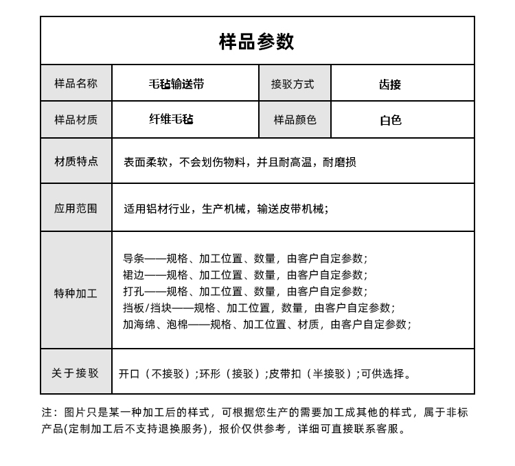 • 產(chǎn)品名稱:凱夫拉毛氈輸送帶耐磨耐高溫耐腐蝕工業(yè)皮帶定制