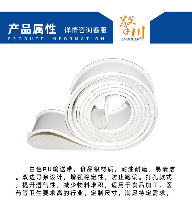• 產(chǎn)品名稱:白色PU輸送帶加雙邊導(dǎo)條打孔耐磨耐油抗拉力強(qiáng)工業(yè)皮帶