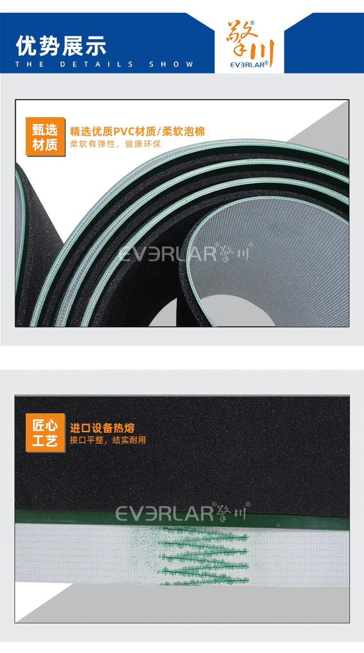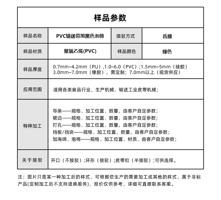 • 產(chǎn)品名稱:綠色PVC輸送帶加黑色泡棉耐磨耐腐蝕耐高溫工業(yè)皮帶定制