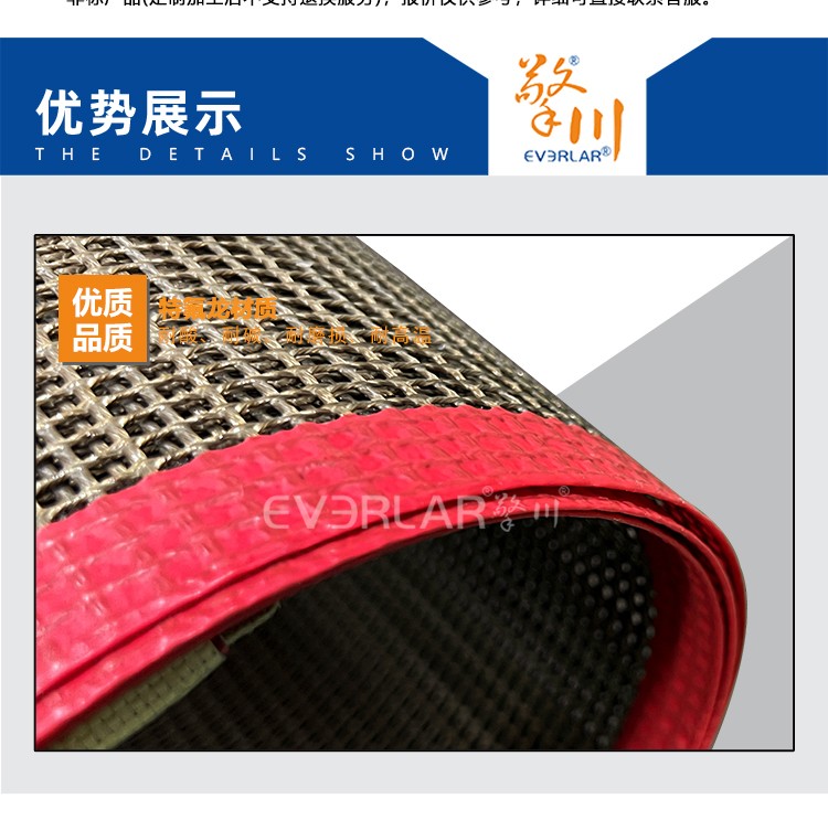 • 產(chǎn)品名稱:鐵氟龍網(wǎng)格輸送帶耐高溫耐腐蝕防粘食品行業(yè)粉條烘干機專用機械皮帶擎川定制