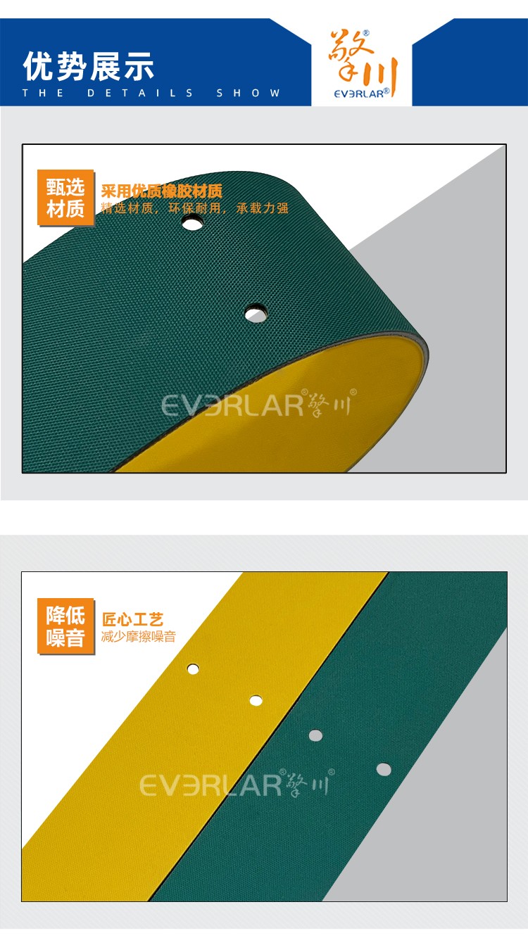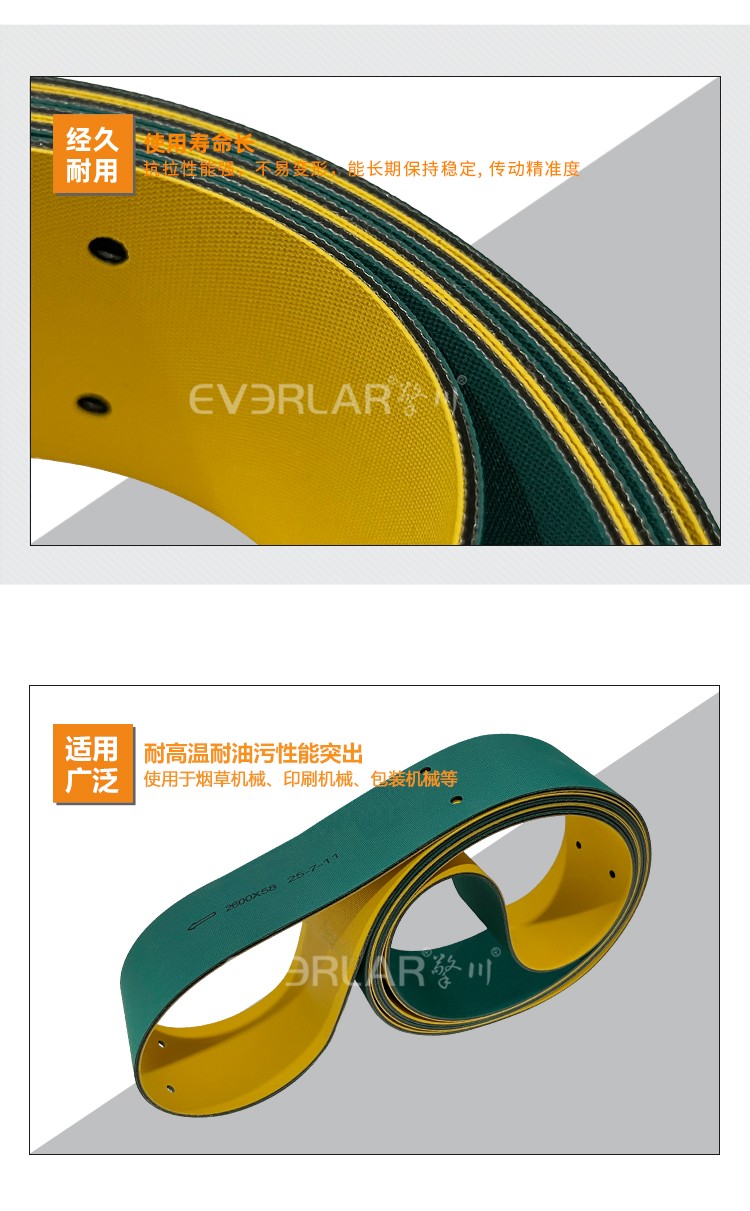 • 產(chǎn)品名稱:黃綠片基帶加打孔低噪音抗撕裂印刷紡織包裝行業(yè)高速傳動帶