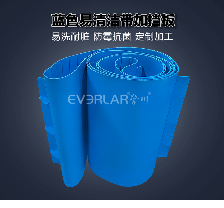 為食品、醫(yī)藥、包裝、日化提供一站式特殊定制藍(lán)色易潔帶加擋板:食品級(jí)輸送帶防溢抗污肉類廠